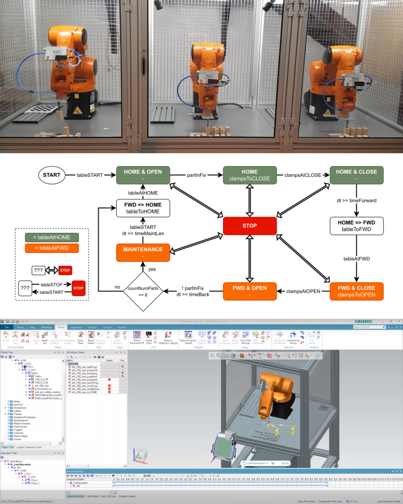 Our task was to build a toy block house with a 6-DOF robotic arm. We designed a state machine and HMI in TIA Portal, simulated the process in PLCsim and Process Simulate, and delivered it to a real robot.