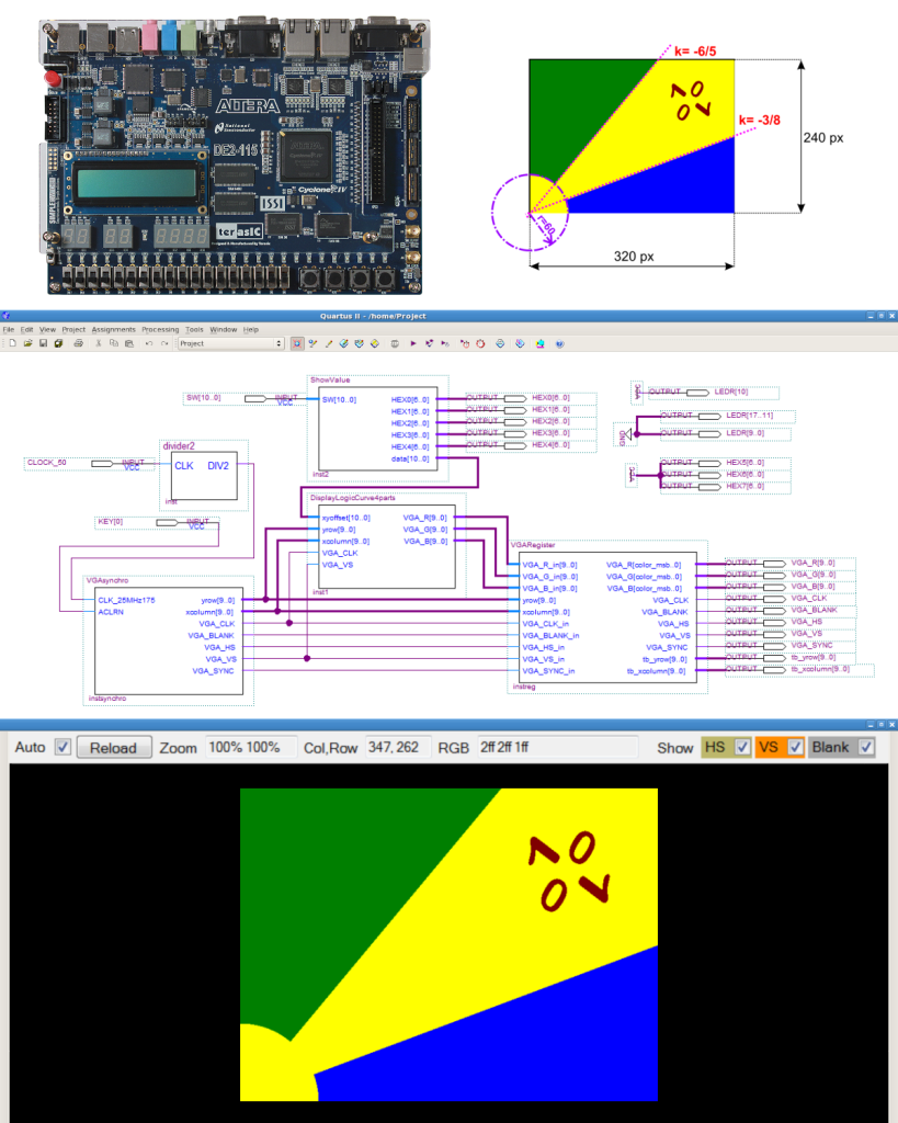 On an FPGA board Altera DE2, we created two video signal generators and a fade switch in between them. We designed the HW using VHDL in Quartus, simulated it in ModelSim, and tested it on the board.