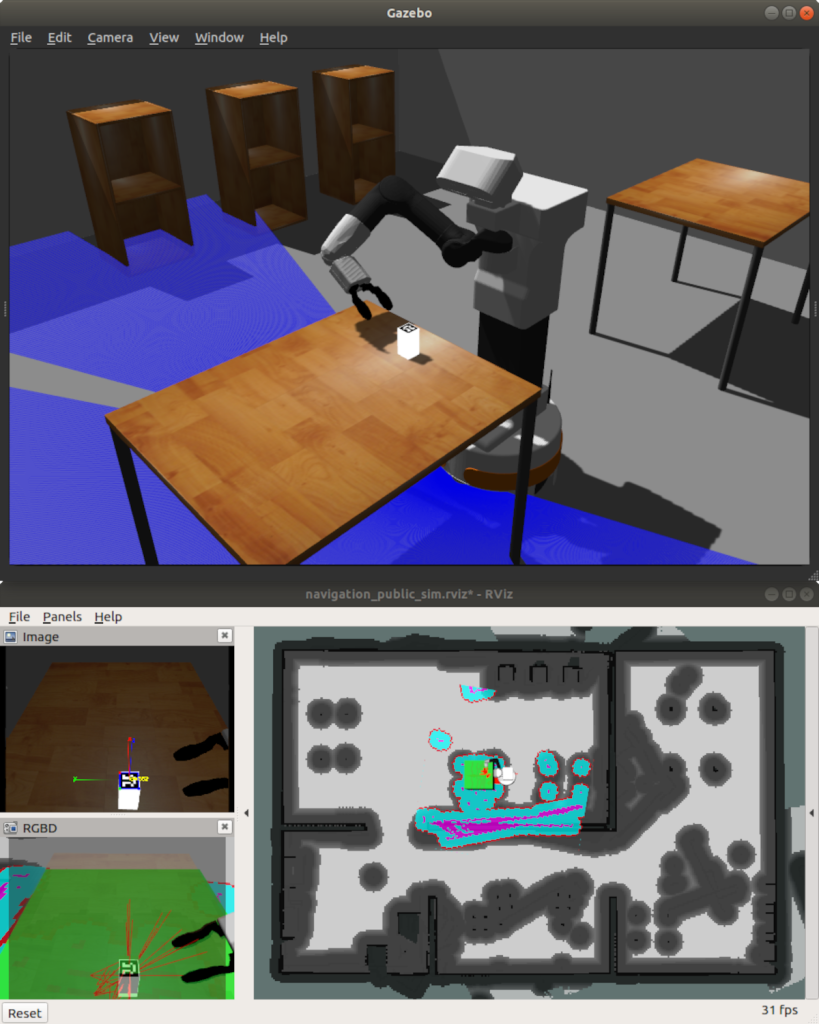 We made a robot pick up and move a cube between tables in different rooms. Our task was to design a robust behavior tree and implement sub-processes of SLAM and locomotion, utilizing ROS and Gazebo.