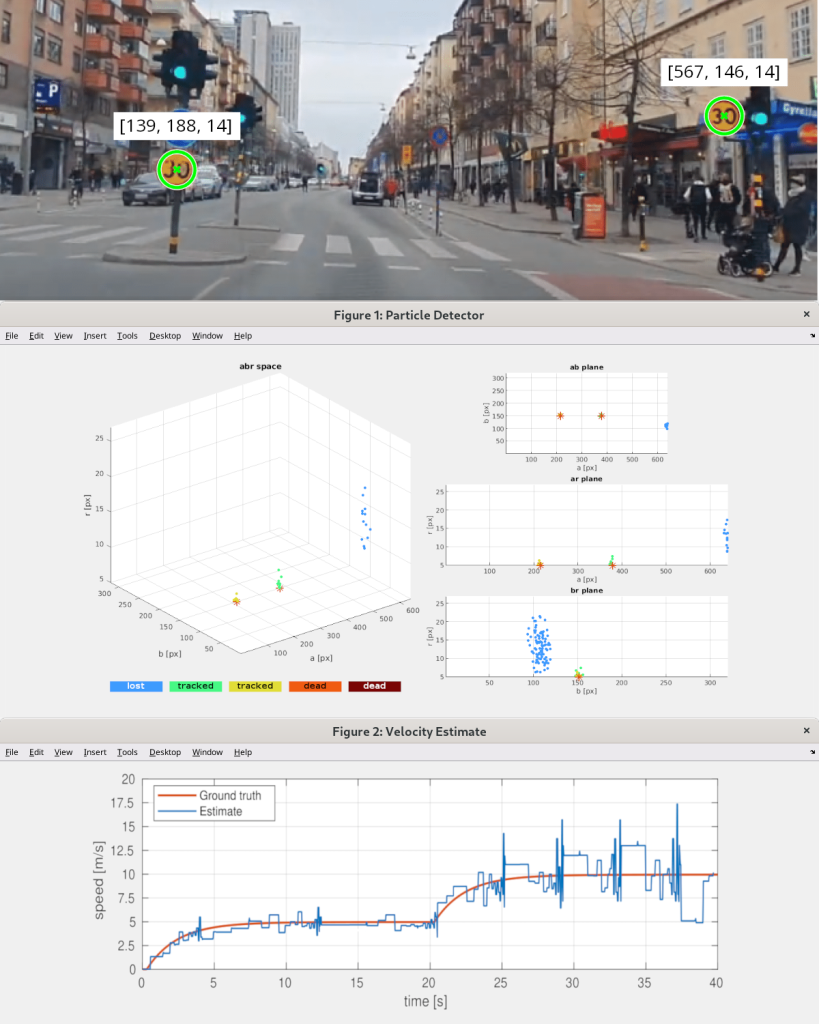 We tried to estimate a vehicle’s speed from passing traffic signs. We used computer-vision methods to detect the signs on a video, a particle filter to track them, and a Kalman filter to estimate the speed.