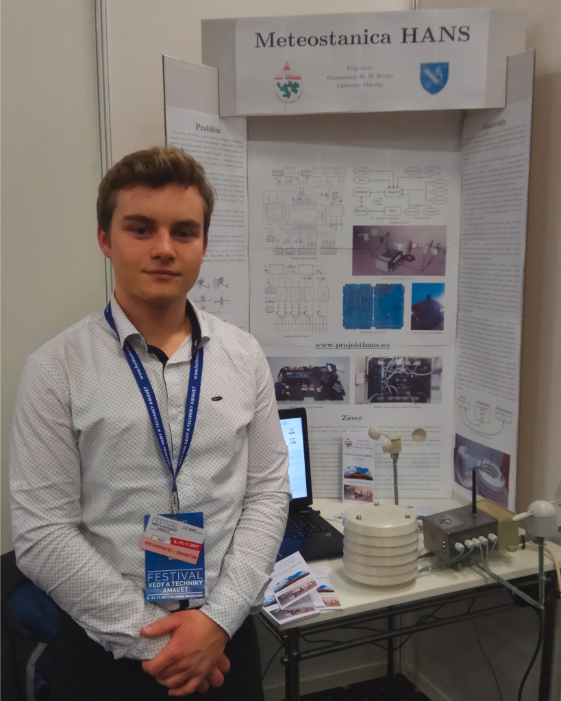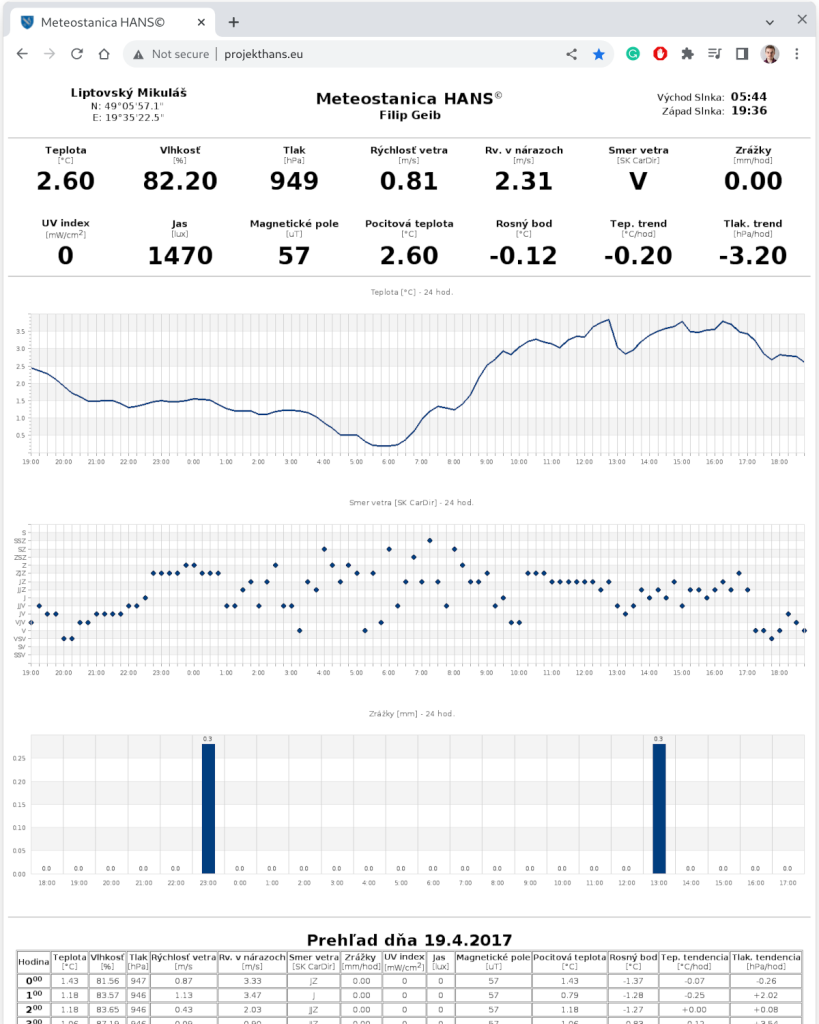 The weather station HANS is a project I created for a STEM fair AMAVET. The station features a radiation shield for precise measurements, a heated anti-freeze anemometer and wind vane, and a snow-melting rain gauge. Additional properties such as UV index, strength of magnetic field, or light intensity were also measured. All the data is wirelessly transmitted to a server and displayed on a website providing detailed charts, measurement history, and extra information such as a dew point or an apparent temperature.