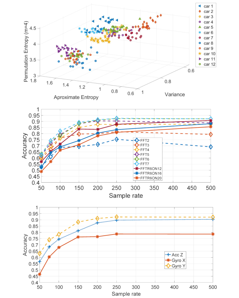 In the vehicle identification project I joined a research team answering a cybersecurity call. We developed a method of fingerprinting vehicles using IMU measurements. The identity of each vehicle could be verified by trained machine learning models based on the vehicle’s mechanical vibrations and driving style. My tasks included creating datasets, automating signal processing in Python, and designing dimension reduction and deep learning experiments in MATLAB. The research resulted in two peer-reviewed papers (here and here).